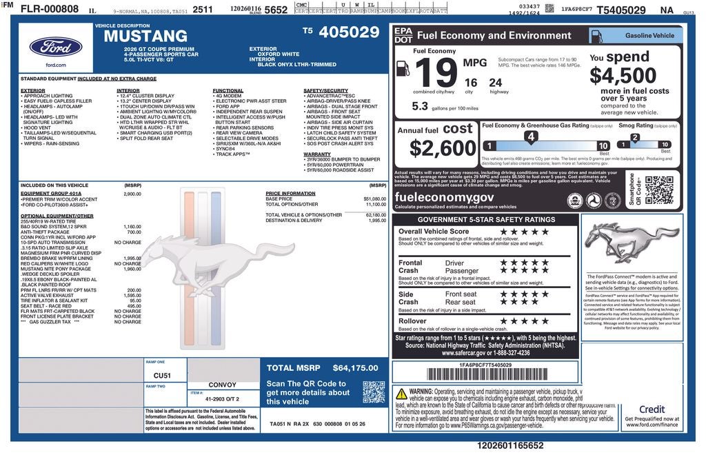 2026 Ford Mustang GT Premium RWD 5.0L V8 Ti-VCT 10-Speed Automatic Pyz ***CONFIRM AVAILABILITY*** (CALL DIRECTLY TO: 815-725-3033).