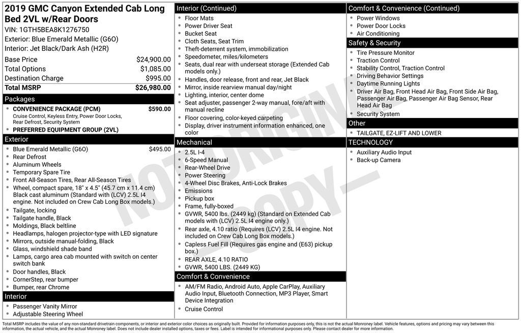 This 2019 GMC Canyon Base is a certified pre-owned vehicle, meaning it has undergone a rigorous inspection and reconditioning process to ensure it meets the highest standards of quality and reliability. With the confidence of a comprehensive warranty, you can drive with assurance.